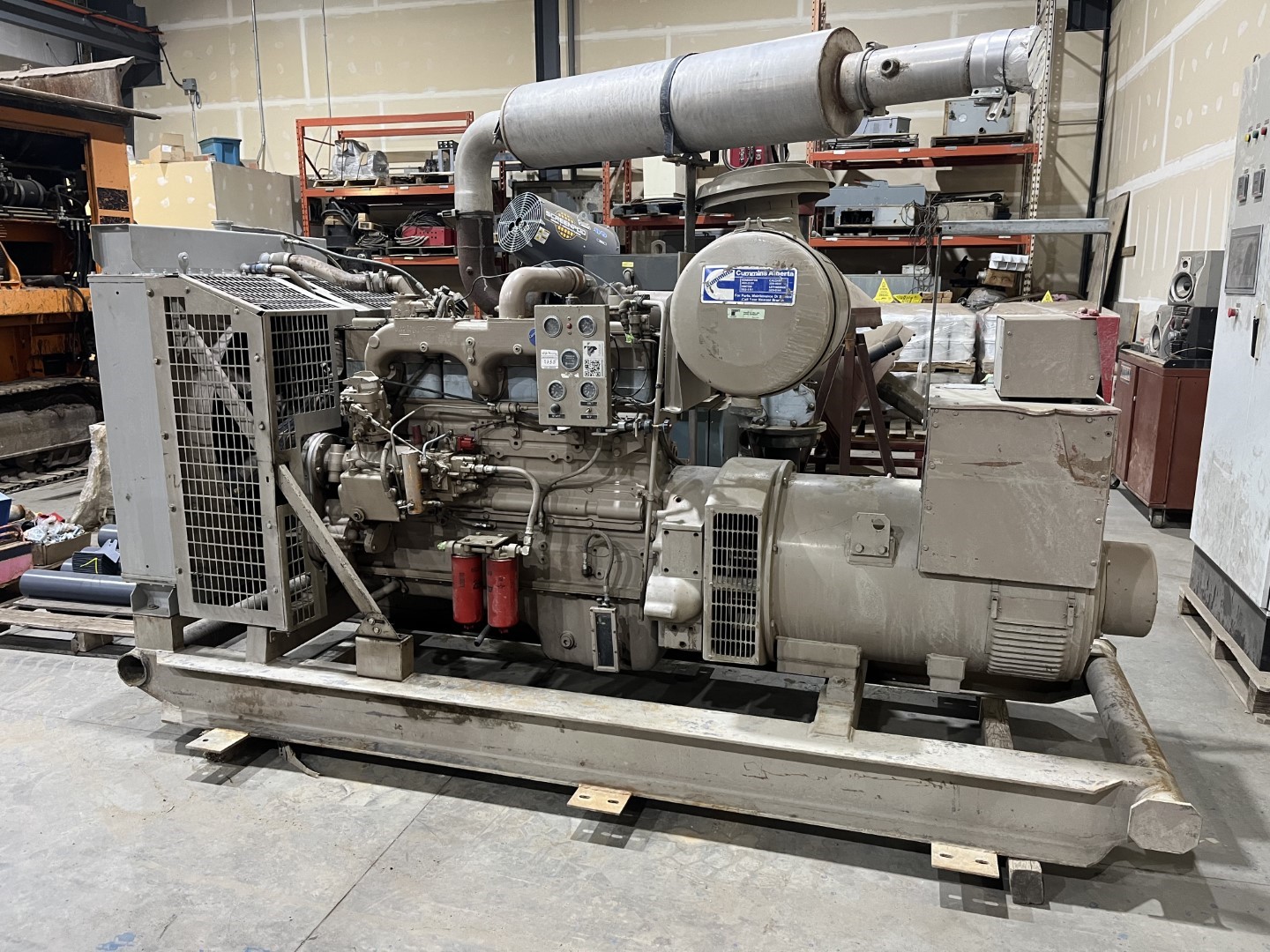 Cummins 313 Kw Genset - 6 cylinder turbo engine - Main breaker - Cummins Model NT855 - Muffler & stand included. Heads rebuilt, new injectors Dec 2021. Unit completely cleaned, serviced and load tested Feb, 2203